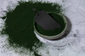 Selektywny fokus algi spirulina w proszku na białym na czarnym tle