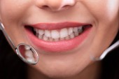 Gabinet stomatologiczny ręka biorąc badanie śliny w ustach kobiety z wacikiem
