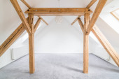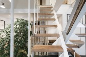 Schody sosnowe w hali. Nowoczesne, jasne poddasze Apartament.