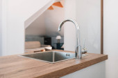 Biały zlewozmywaka z chrom Bateria. Otwarta kuchnia jasne białe meble.