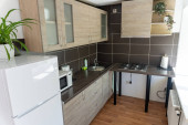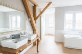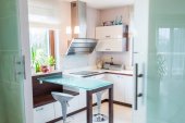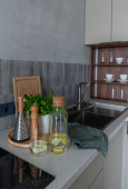 Zdjęcie "Biały zlewozmywaka z chrom Bateria. Otwarta kuchnia jasne białe meble." może być wykorzystywane do celów osobistych i komercyjnych zgodnie z warunkami zakupionej licencji Royalty-free. Obraz jest dostępny do pobrania w jakości wysokiej rozdzielczości do 5760x3840.