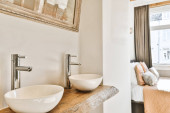 Zdjęcie "Podwójną umywalkę białą w vintage w stylu loft łazienka" może być wykorzystywane do celów osobistych i komercyjnych zgodnie z warunkami zakupionej licencji Royalty-free. Obraz jest dostępny do pobrania w jakości wysokiej rozdzielczości do 5760x3840.