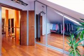 Nowoczesna sala i widok na salon z szary mur z pustej ramki biały. Nowoczesne, jasne poddasze Apartament.