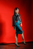 Portret pięknej kobiety Brunetki noszenie t-shirt różowy i czarny garnitur, siedząc w fotelu z półki na tle