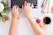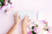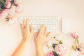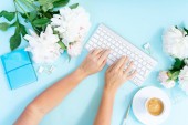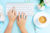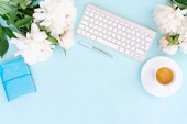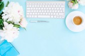 Obszar roboczy płasko świeckich domowego biura na niebieski