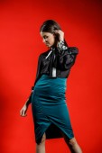 Portret młodego modelu w ubranie na czerwonym tle. Młoda kobieta w czarnej koszuli i niebieski spódnica pozowanie Studio
