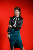 Portret młodego modelu w ubranie na czerwonym tle. Młoda kobieta w czarnej koszuli i niebieski spódnica pozowanie Studio