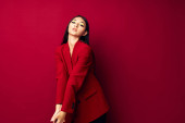 Portret młodego modelu w ubranie na czerwonym tle. Młoda kobieta w czarnej koszuli i niebieski spódnica pozowanie Studio