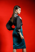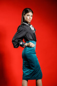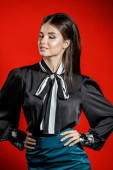 Portret młodego modelu w ubranie na czerwonym tle. Młoda kobieta w czarnej koszuli i niebieski spódnica pozowanie Studio
