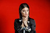 Zbliżenie studio portret młodego model w ubranie. Młoda kobieta z fryzura stylowa, Czarna Koszula z kokardą na sobie na szyję stojąc na czerwonym tle