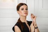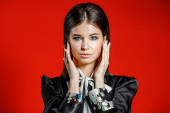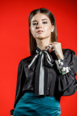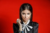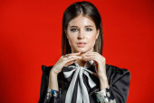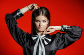Zbliżenie studio portret młodego model w ubranie. Młoda kobieta z fryzura stylowa, Czarna Koszula z kokardą na sobie na szyję stojąc na czerwonym tle