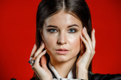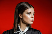 Zdjęcie "Zbliżenie studio portret młodego model w ubranie. Młoda kobieta z fryzura stylowa, Czarna Koszula z kokardą na sobie na szyję stojąc na czerwonym tle " może być wykorzystywane do celów osobistych i komercyjnych zgodnie z warunkami zakupionej licencji Royalty-free. Obraz jest dostępny do pobrania w jakości wysokiej rozdzielczości do 5760x3840.