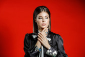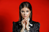 Zbliżenie studio portret młodego model w ubranie. Młoda kobieta z fryzura stylowa, Czarna Koszula z kokardą na sobie na szyję stojąc na czerwonym tle