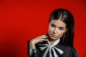 Zdjęcie "Zbliżenie studio portret młodego model w ubranie. Młoda kobieta z fryzura stylowa, Czarna Koszula z kokardą na sobie na szyję stojąc na czerwonym tle " może być wykorzystywane do celów osobistych i komercyjnych zgodnie z warunkami zakupionej licencji Royalty-free. Obraz jest dostępny do pobrania w jakości wysokiej rozdzielczości do 5760x3840.