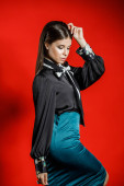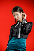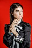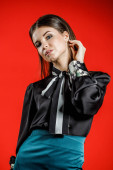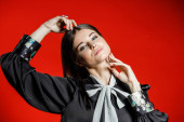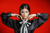 Zbliżenie studio portret młodego model w ubranie. Młoda kobieta z fryzura stylowa, Czarna Koszula z kokardą na sobie na szyję stojąc na czerwonym tle