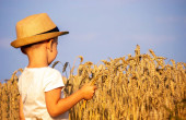 Szczęśliwa rodzina. Ojciec i syn na pole pszenicy. Mężczyzna pokazuje chłopiec Kłos pszenicy.