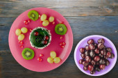 ciastko deser z kiwi i truskawek na tle drewnianych. Świąteczny deser na widok z góry płyty