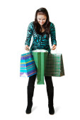 kobieta siedzi na podłodze za torby na zakupy
