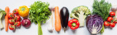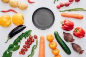 Widok z góry pusty talerz okrągły i świeżych organicznych warzyw na białym tle