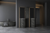 Zdjęcie "Biały i czarny marmur luksusowe wnętrze łazienki z kabina prysznicowa i umywalka z lustrem rundy. Leżak. makiety 3D renderowania" może być wykorzystywane do celów osobistych i komercyjnych zgodnie z warunkami zakupionej licencji Royalty-free. Obraz jest dostępny do pobrania w jakości wysokiej rozdzielczości do 5760x3840.