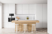 Zdjęcie "Stojąc w nowoczesną kuchnię z białe ściany i podłogi drewniane białe blaty. makiety 3D renderowania" może być wykorzystywane do celów osobistych i komercyjnych zgodnie z warunkami zakupionej licencji Royalty-free. Obraz jest dostępny do pobrania w jakości wysokiej rozdzielczości do 5760x3840.