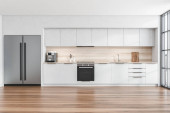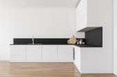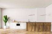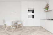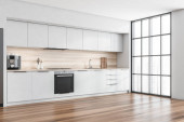 Stojąc w nowoczesną kuchnię z białe ściany i podłogi drewniane białe blaty. makiety 3D renderowania