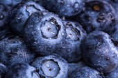 Świeże dojrzałe jagody z kroplami rosy. Wiśniowe tło. Zdjęcie makro