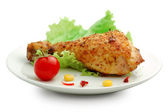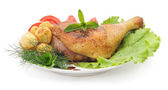 smaczny kurczak cały pieczony na talerz z warzywami, na białym tle