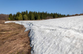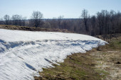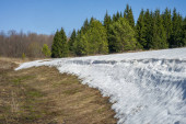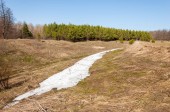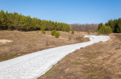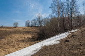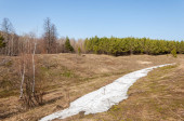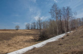 Wiosenny krajobraz. Ostatni śnieg na polu wiosną. pagórkowaty teren. drzewa bez liści. ciepłe dni są pierwszym