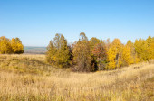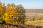 Jesienny krajobraz. Dziedzinie orki na tle drzewa jesień. kolorowe drzewa. żółty, złoty kolor brązowy czerwony.