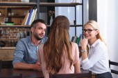 kobiece Doradca pisania w schowku i mówi do frustracji człowieka podczas sesji terapii w biurze
