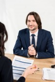 Zdjęcie "uśmiechnięty mężczyzna rozmawia z psychiatra kobiece a ona pisania w Schowka pakietu office " może być wykorzystywane do celów osobistych i komercyjnych zgodnie z warunkami zakupionej licencji Royalty-free. Obraz jest dostępny do pobrania w jakości wysokiej rozdzielczości do 5760x3840.