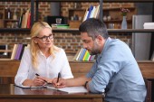 Widok z tyłu kobiece doradcy pisania w schowku, podczas gdy para trzymając się za ręce z siebie przy stole w biurze