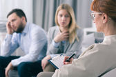 Kobieta gestem przez ręce i kłócić się z podkreślił mąż siedzi z dłoni na czole przy stole na sesji terapii przez kobiece doradcy w biurze