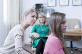 kobiece Doradca trzymając rękę zdenerwowany nastolatkę siedzi w pobliżu brat na sesji terapii