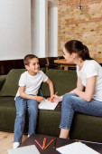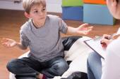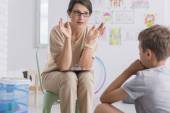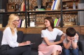 zły, nastoletnie dziewczyny, wskazując ręką na mały brat robi wzruszając ramionami gest na sesji terapii rodzinnej przez kobiece Doradca