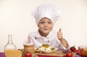 zabawny chłopak chef gotowane Sałatka z warzyw, sera i szynki na talerzu