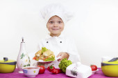 Szef kuchni zabawny chłopak gotowane ciasto z wig i porzeczki na talerzu