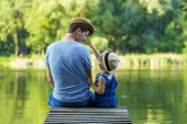 Tata i malutka dziewczynka w ogrodniczki relaks nad rzeką. Widok z tyłu, miejsce.
