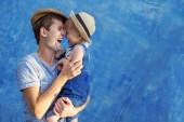 Zdjęcie "Ojciec i córka przytulić i śmiech na niebieskim tle. Miejsce." może być wykorzystywane do celów osobistych i komercyjnych zgodnie z warunkami zakupionej licencji Royalty-free. Obraz jest dostępny do pobrania w jakości wysokiej rozdzielczości do 5760x3840.