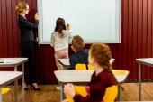 Widok z tyłu dziewczyny dojrzale, pisanie na tablicy podczas lekcji