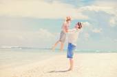 Ojciec i córka stoją na plaży i patrzeć na morze. Widok z tyłu, miejsce.