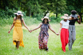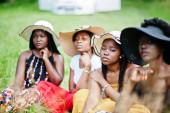 Trzy stylowe womans african american stwarzane w słoneczny letni dzień odkryty.