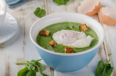 Zupa szpinak z jajkiem sadzonym, grzankami świeże i zioła w Zdjęcie stockowe reklama