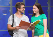 Para młodych studentów, opierając się na szafki w kolegium korytarza