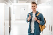 szczęśliwy przystojny student chodzenie przez kolegium korytarza