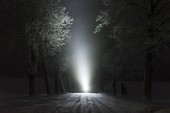 Człowiek stojący na zewnątrz w nocy w drzewo alley świeci z latarką. Piękne ciemne snowy zimowych nocy.