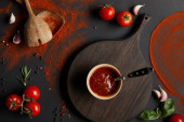 płaskie ukształtowanie pomidor smaczny zupy i chleba wbija na stół szary
