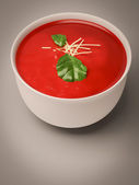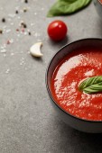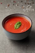 smaczny czerwony pomidorowa z bazylią w talerze na stole szary