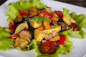 Sałatka z klopsiki, bakłażan, pieczarki i pomidory w stylu azjatyckim. Zdrowe jedzenie. Posiłki diety. Widok z góry. Leżał z płaskim.